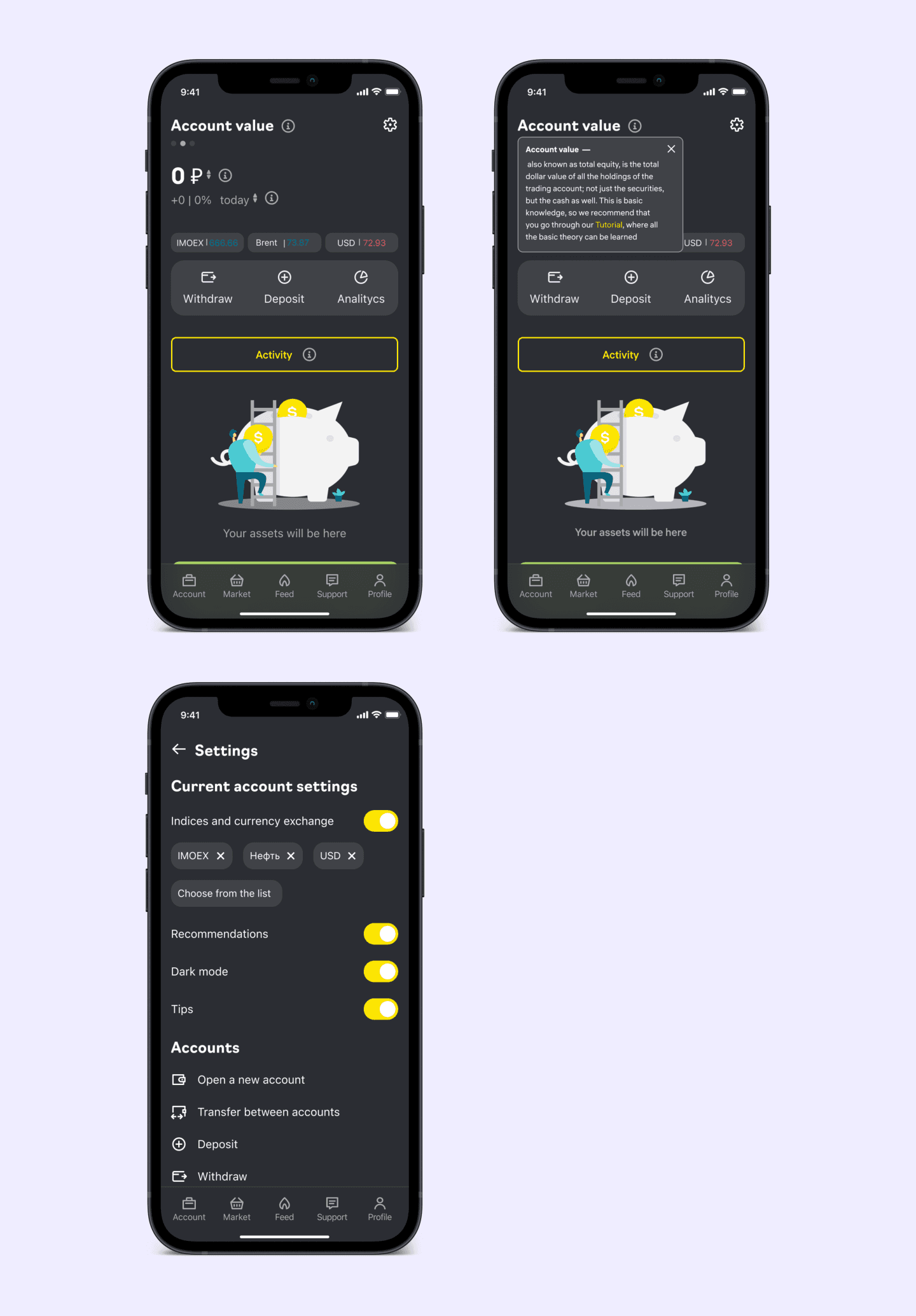 Raiffeisen Bank in Russia offers an investing app for private users. Despite the growing interest in investing, many people lack knowledge about basic terms, rules, and market features. My goal was to enhance the learning process by adding explanatory materials to the existing application, making it more user-friendly for beginners while keeping it efficient for experienced users.